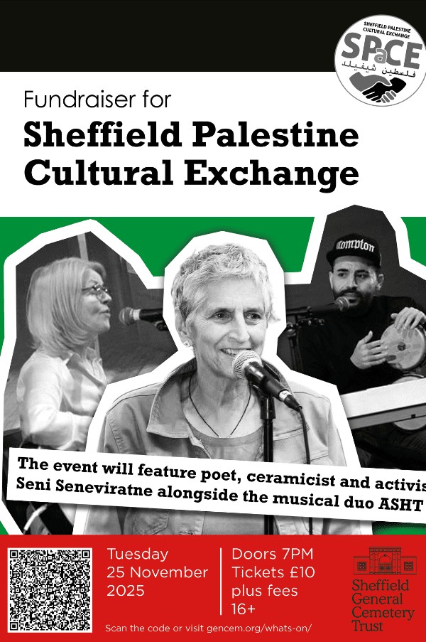 A must see evening of music, song and poetry for peace will take place at the Samuel Worth Chapel to raise funds for Sheffield Palestine Cultural Exchange (SPaCE). The event will feature poet, ceramicist and activist Seni Seneviratne alongside the musical duo ASHTI.